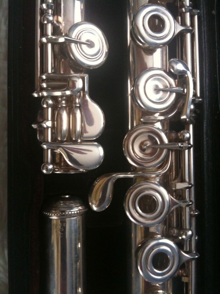 Verne Q Powell flute (S/N 22**), sterling silver (0.014 tubing) with gold embouchure and riser. Traditional Powell tone hole and Scale A=440, inline G, soldered […]